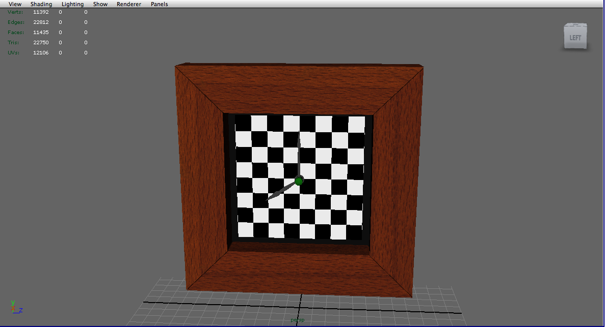 I began texturing the clock by applying a wood texture to the frame. I first applied a simple checkered texture to the framework so that I could clearly see where the wood texture would stretch. I then planar mapped each face that was visible to the camera according to the axis which they were aligned to. I then used the UV texture editor in order to edit the size of the checkered squares so that they were no longer stretched and formed perfect squares. I also made sure that the squares were decreased in size so as to improve detail and resolution. Once all the faces were UV mapped I then applied the wood finish. I used a blinn shader in order to achieve a small amount of reflection. I then applied a grayscale and slightly more contrasted version of the same wood texture to the blinn as a bump map so that an illusion of depth is achieved to the wood grain.